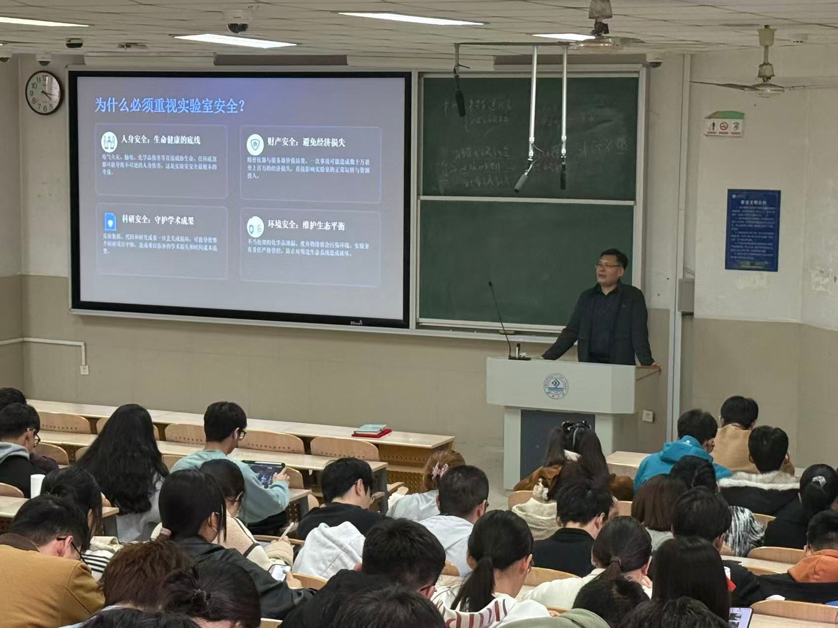 结合研究生科研工作的特殊性,实验室中心主任孙传伟围绕实验室安全管理规定、实验操作规范、应急处置流程等内容,为同学们进行了细致讲解。他通过典型事故案例复盘、安全警示视频播放等方式,直观展现了不规范操作引发安全事故的严重后果,深刻阐述了严格遵守实验室安全规则的重要性与必要性,引导同学们时刻绷紧安全之弦,规范操作、防患未然。研究生辅导员孙泉聚焦宿舍安全,解读了宿舍安全管理制度及校保卫处电动车管理要求,从日常管理、电动车整治等方面开展安全教育,提醒同学们警惕安全隐患。