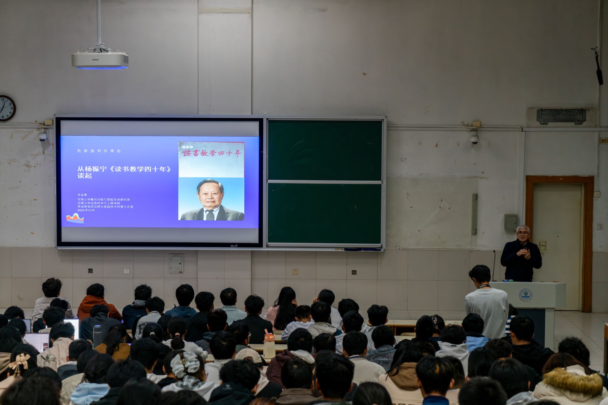 随后,李金屏教授以杨振宁院士的著作《读书教学四十年》为切入点,围绕“勿忘历史,珍惜当下;好好学习,报效祖国”的主题,为在场师生带来了一场内容丰富、启迪深刻的分享。李教授结合自身求学与科研工作的亲身经历,分享了独到的读书心得与人生感悟,并就学业规划与个人成长为同学们提供了切实可行的指导,现场反响热烈。